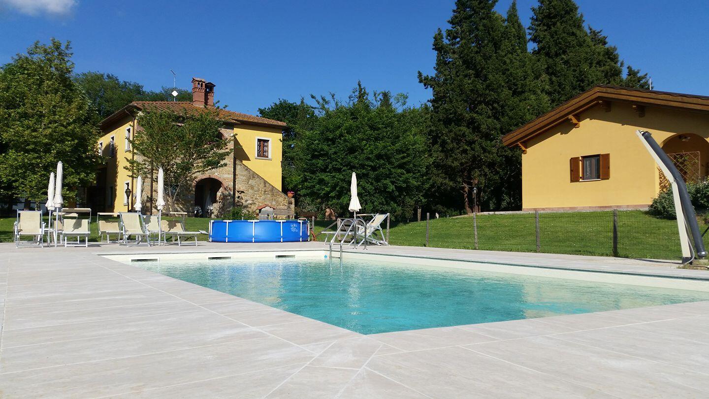 The main building is divided into two floors: the upper floor, reached via a traditional stone staircase, features a covered loggia offering beautiful Tuscan landscapes and the town of Castiglion Fiorentino in the background. From the loggia, two apartments are accessible: Melo in Fiore and Glicine Giallo (sleeps 3-5 each), each measuring 65 square meters. Both apartments feature a large kitchen, living room, bedroom, and bathroom with shower, and are furnished with period furniture.