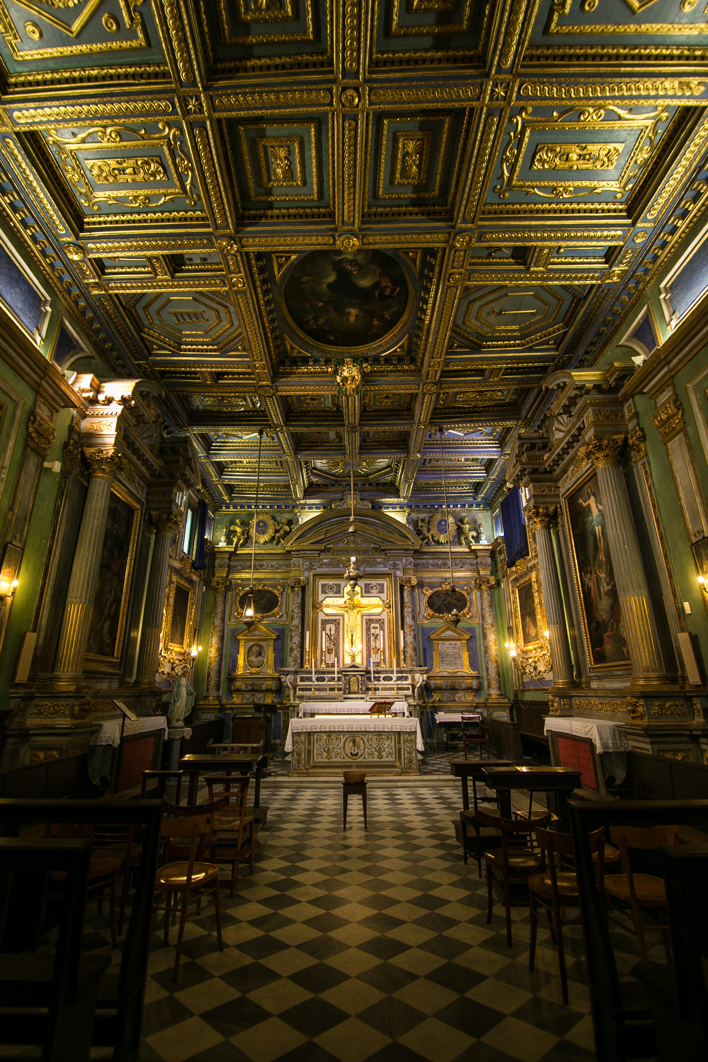 Inside, the church features a single nave dominated by an extraordinary wooden coffered ceiling with carved and gilded motifs from the Passion, created in 1615 by Niccolò Becci in collaboration with Sallustio Lombardi.
